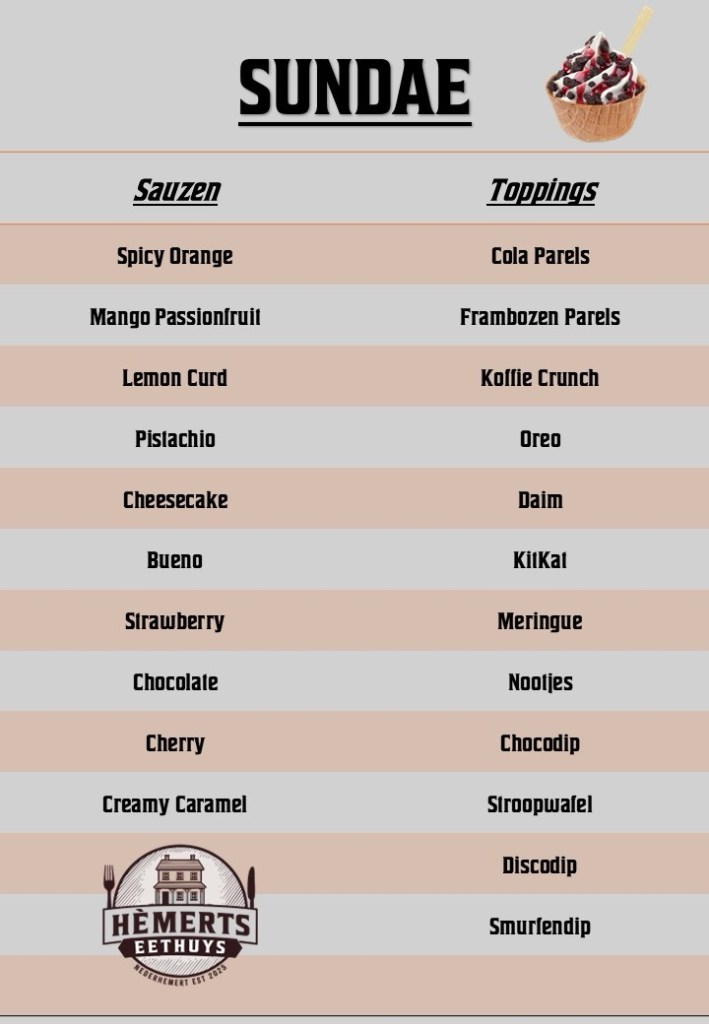 Bij Hèmerts Eethuys maak je jouw eigen droom-Sundae. Kies uit verrassende sauzen zoals Spicy Orange, Mango Passionfruit, of Creamy Caramel, en maak ‘m af met heerlijke toppings – van Oreo tot Stroopwafel of een vrolijke Discodip.