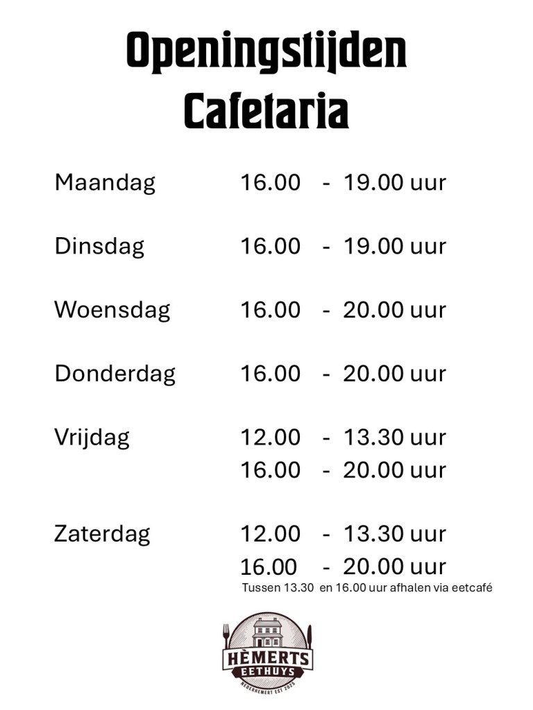 Uit onderzoek is gebleken dat er (bijna) niemand meer honger heeft op MAANDAG en DINSDAG tussen 19.00 en 20.00 uur als het donker is. Dus vandaar dat wij de cafetaria / keuken op deze dagen om 19.00 uur sluiten.