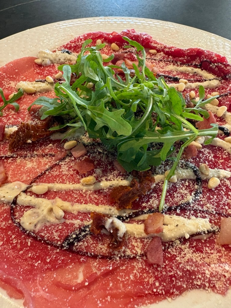 🥩 Carpaccio van Bommelerwaards rund, rijk belegd met truffelsaus, balsamico, Parmezaanse kaas, spekjes, zongedroogde tomaat, pijnboompitten en rucola – €10,50